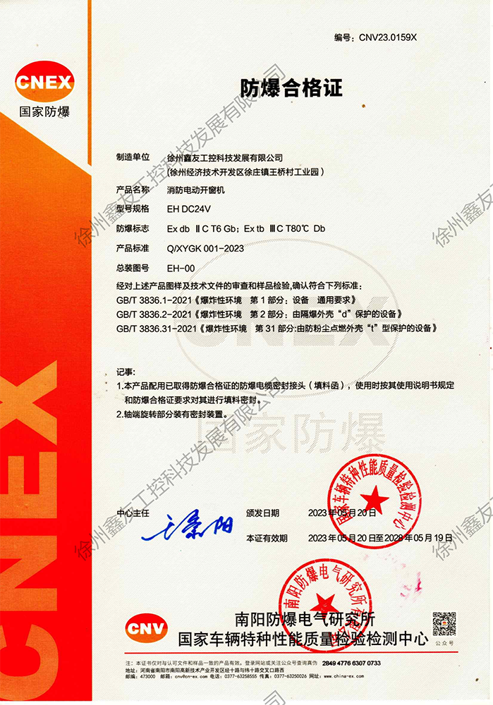 徐州鑫友工控科技發展有限公司成立于2008年,占地31600平方米,全資子公司:江蘇良紫工程科技有限公司,旗下 有“鑫友”及“MASTER.W主人窗控”兩個品牌系列,公司全面貫徹執行IS09001:2015質量管理體系標準,產品順利通過歐盟CE認證和中國***消防電子產品認證,通過可燃性粉塵環境下、爆炸性環境下防爆合格產品檢驗。排煙天窗整窗通過***消防產品質量監督檢驗中心檢測。先后獲得多項******及榮譽證書。集研發、加工、生產、制造、銷售、安裝及售后于一體,是一家高起點、研發能力強的專業智能化企業。